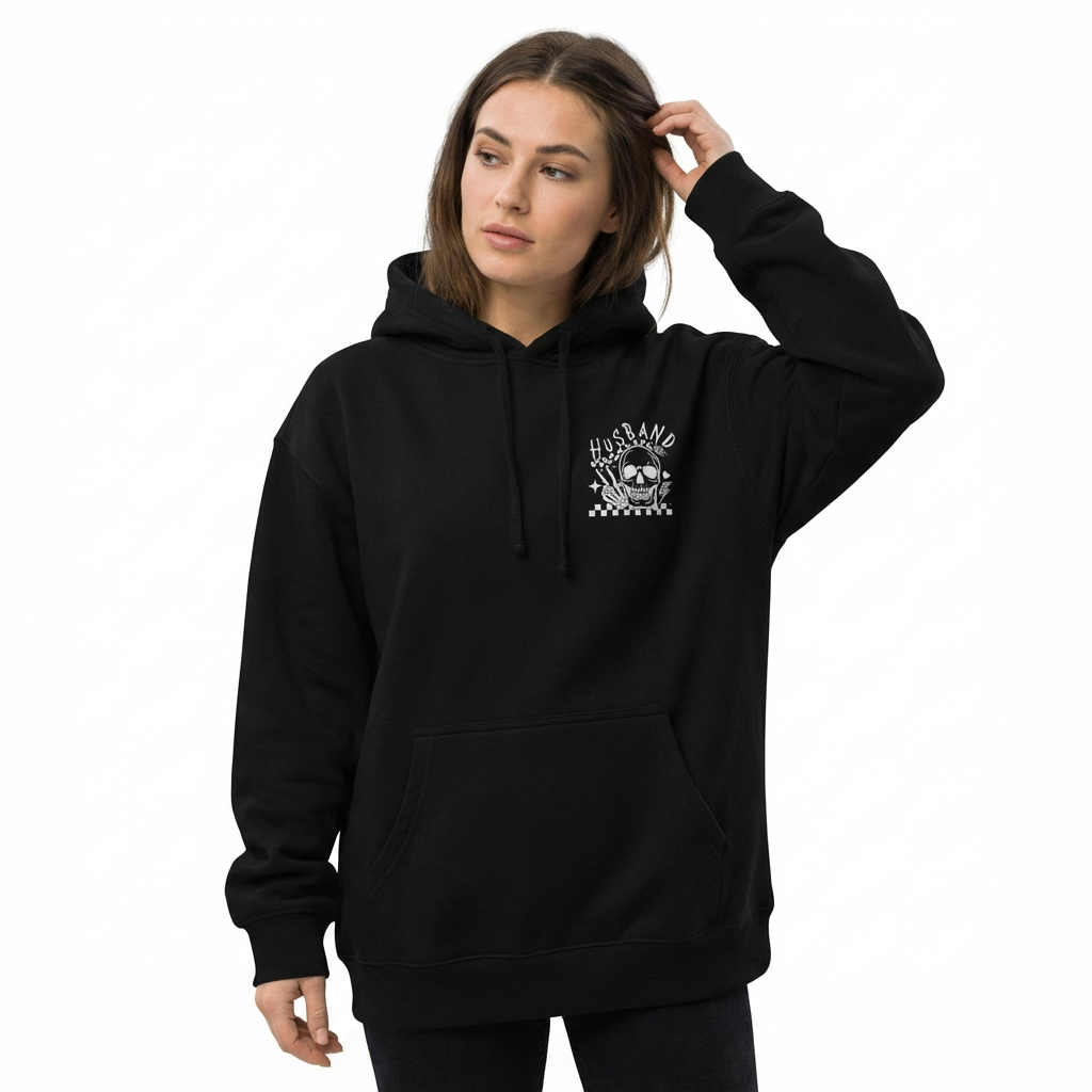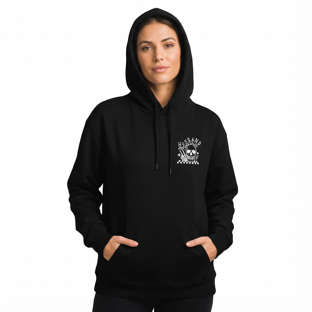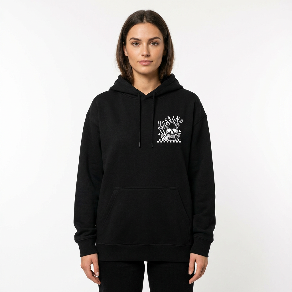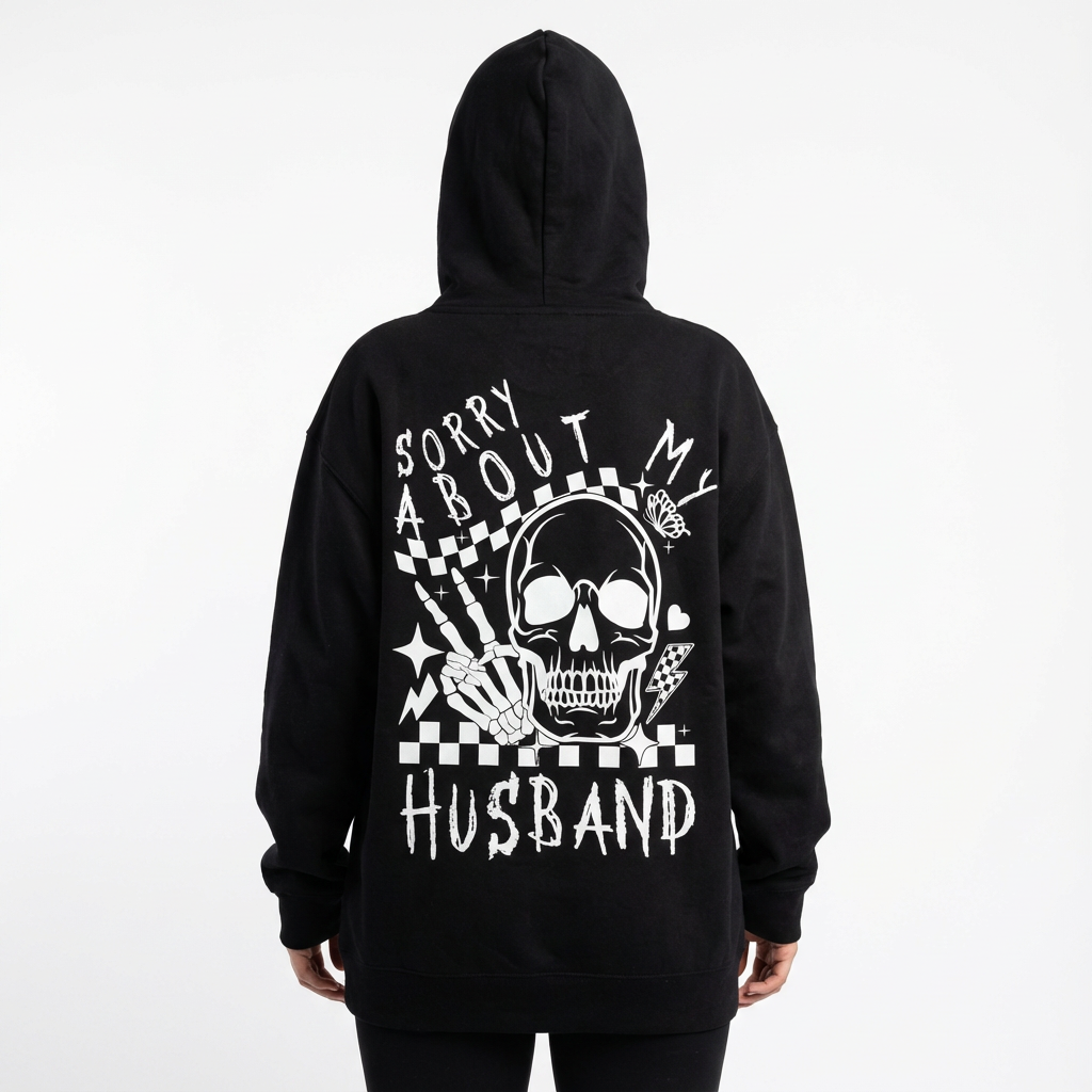 Damen Hoodie Schwarz Sorry About My Husband Oversized mit lustigem Skelett Print