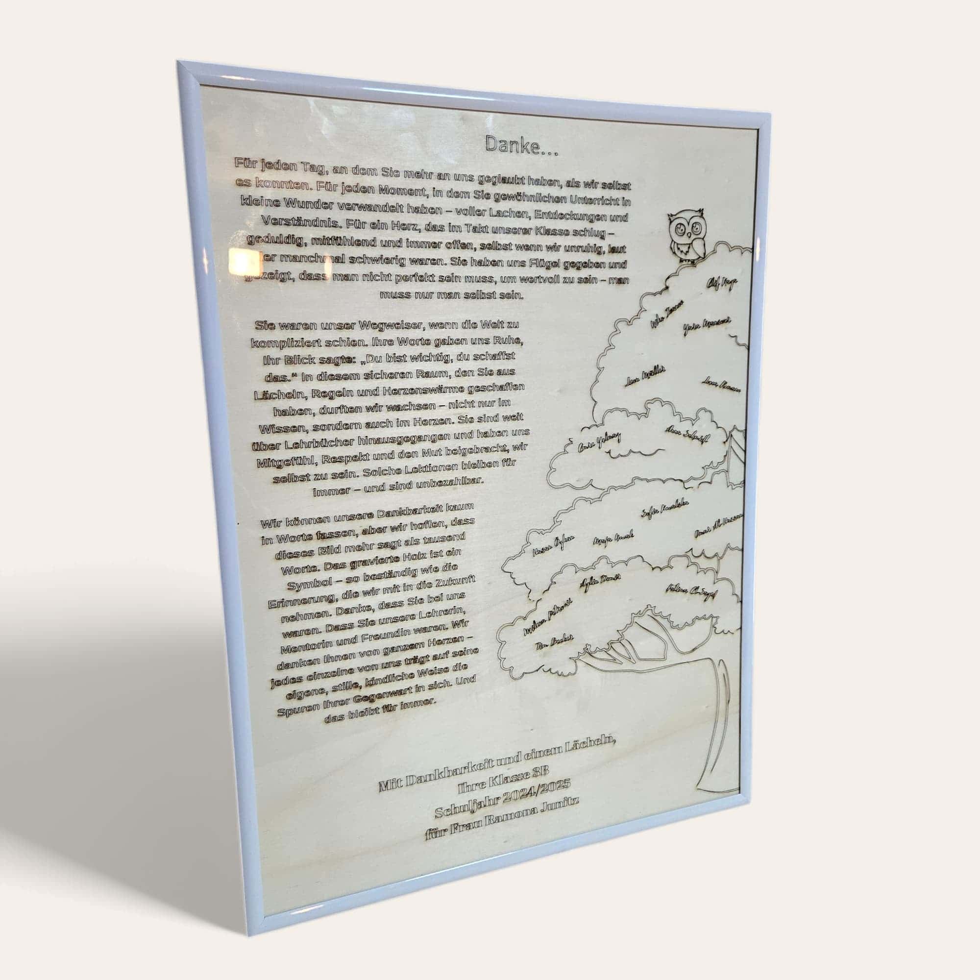 Der gravierte Baum mit den Namen der Kinder symbolisiert Wachstum, Zusammenhalt und den gemeinsamen Weg durchs Schuljahr. Der emotionale Text berührt – ein Geschenk, das garantiert nicht in der Schublade verschwindet.
